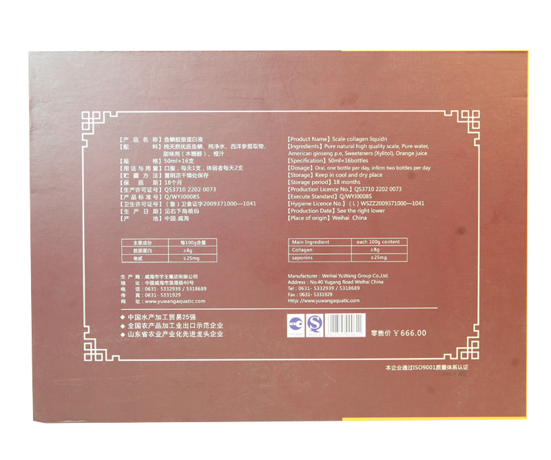 配 料:純天然優質魚鱗、純凈水、西洋參提取物、甜味劑(木糖醇)、橙汁