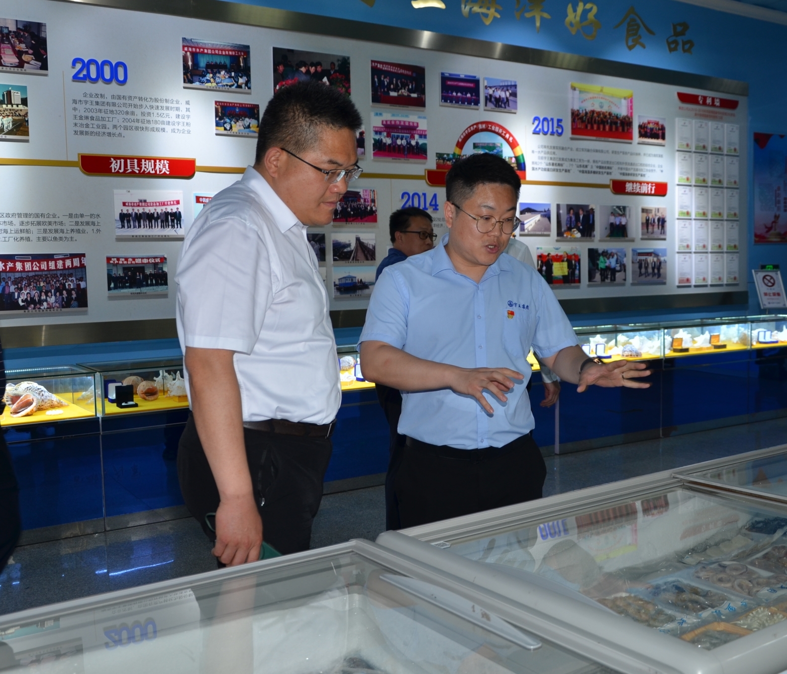 京東考察團參觀宇王集團產品展示大廳,在宇王集團副董事長苗佳琳的介紹下,仔細了解了宇王集團企業規模、海洋產業、海洋預制菜、電子商務發展情況。馮總對宇王集團海洋產業實力表示認可,對電子商務網絡營銷提出指導性意見。